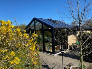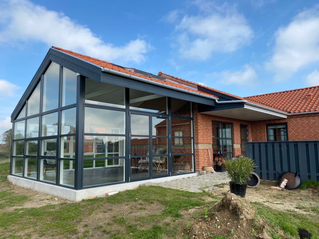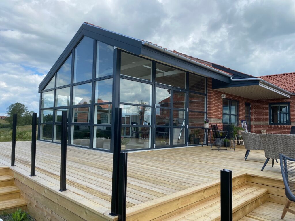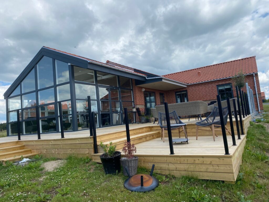 En stor A-model udestue med fast tag og oplukkelige Velux-vinduer. Med 60 m² ny træterrasse foran bliver udestuen udgangspunktet for hele husets udeliv. Konstruktionen er opført i træ-alu lavenergielementer, så rummet er bygget til helårsbrug. Det faste tag giver en solid, huslig fornemmelse, mens Velux-vinduerne sørger for dagslys ovenfra og naturlig ventilation når det er varmt.