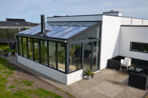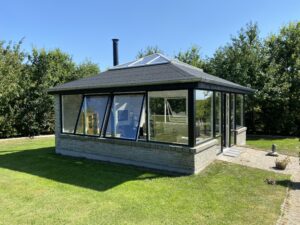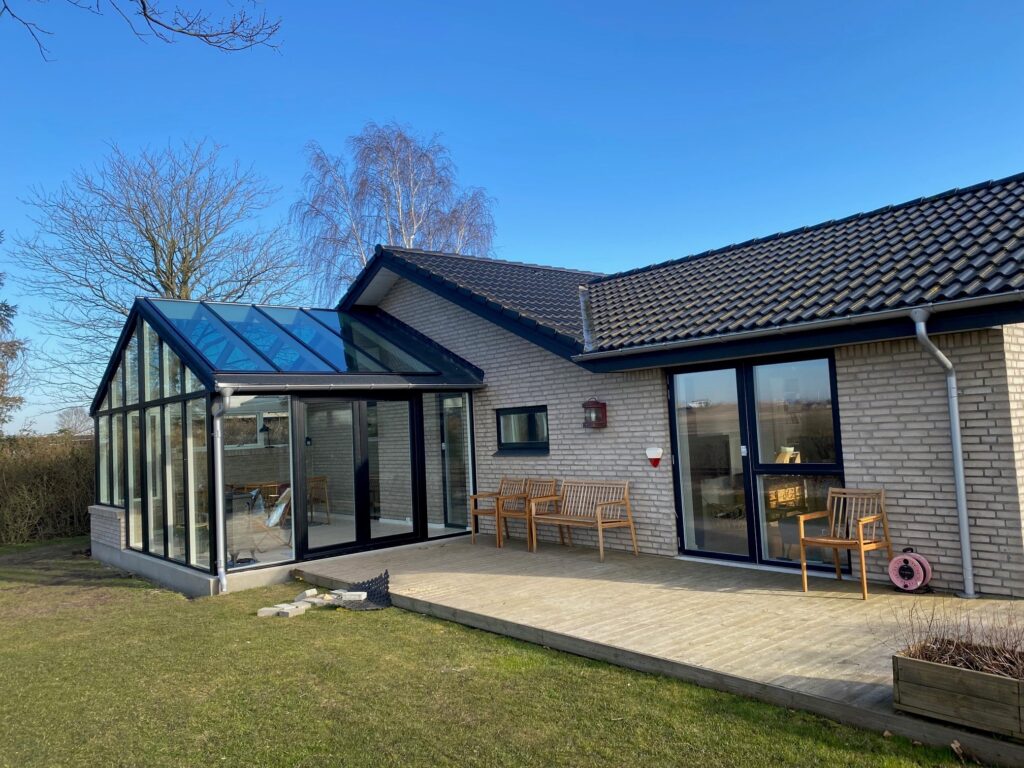 En klassisk A-model med lavenergi glas i både sider og tag. Den delvist opmurede brystmur giver konstruktionen tyngde og karakter, mens glaspartierne sørger for rigeligt med dagslys fra alle vinkler. Energiglasset i taget betyder, at varmen holdes inde — også når solen ikke skinner.