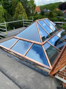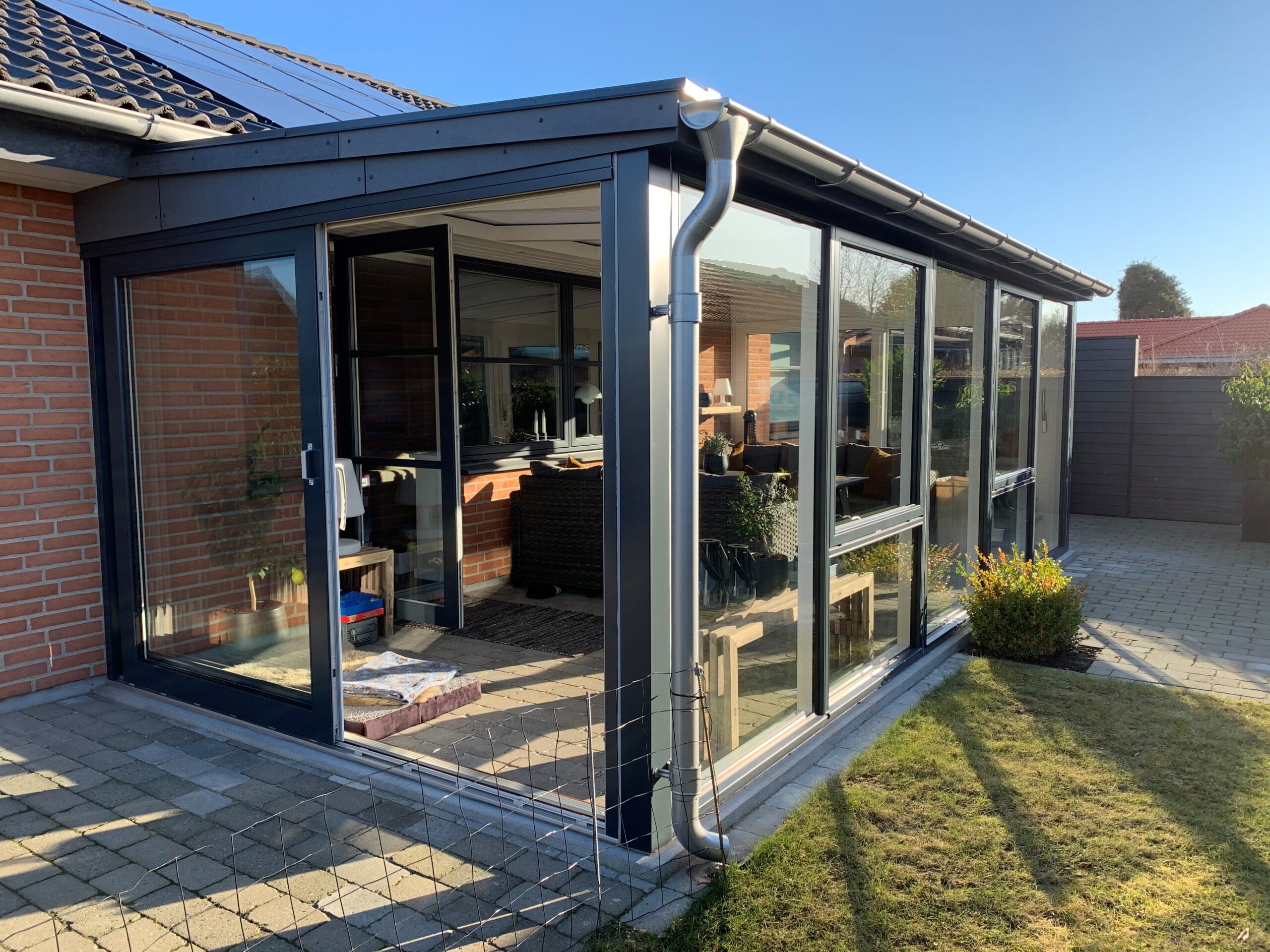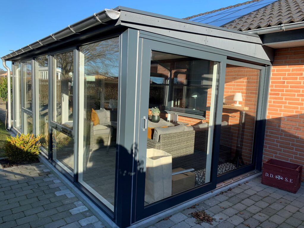 En ensidet vinterhave i antracitgrå aluminium, bygget direkte op ad huset. Vinterhaven følger husets taglinje med fast tag og store glaspartier fra gulv til loft på tre sider. De mørke aluprofiler spiller godt sammen med husets røde mursten og skaber en moderne kontrast. Med skydedøre ud mod haven og et generøst lysindtag fungerer rummet som en naturlig forlængelse af stuen.