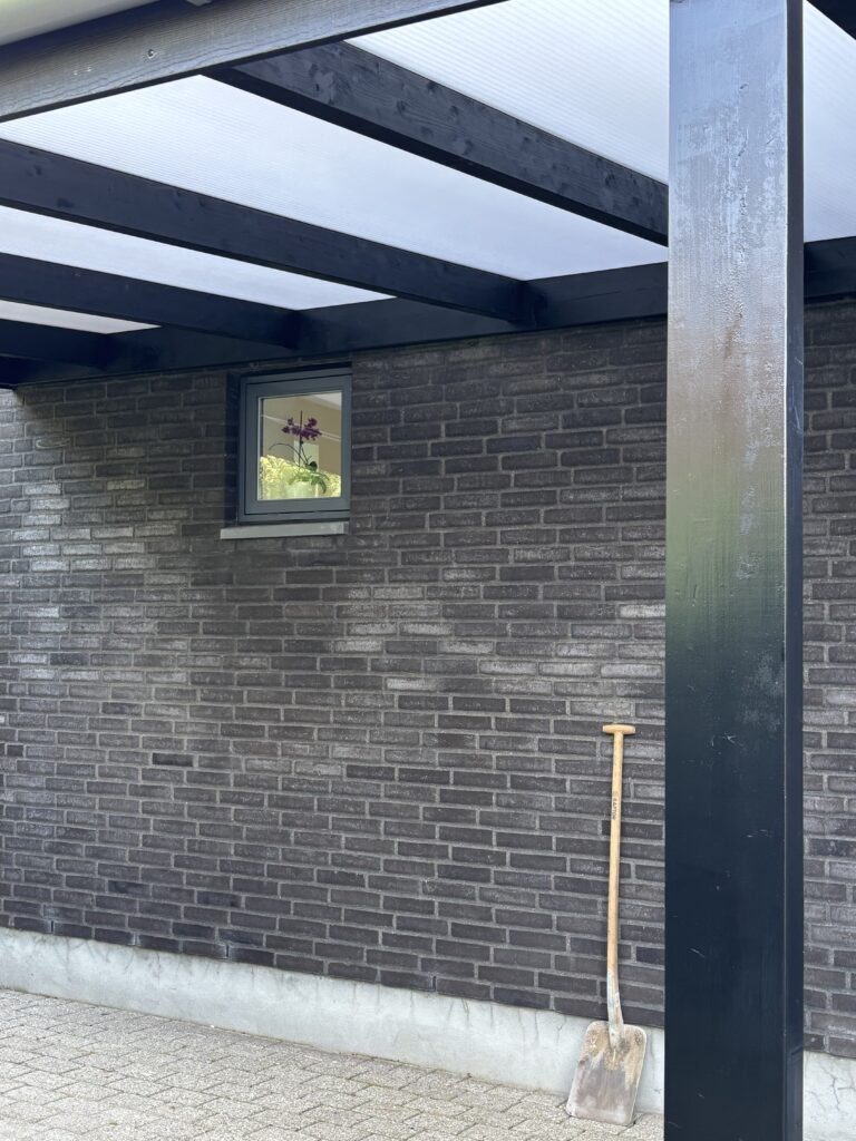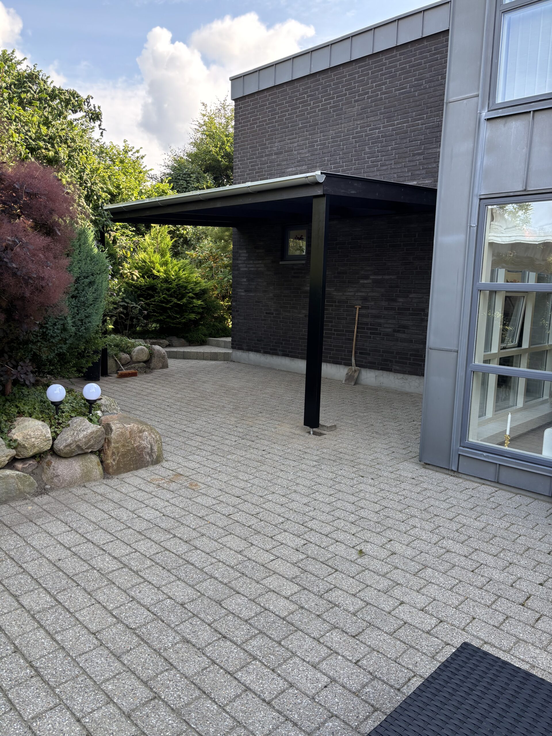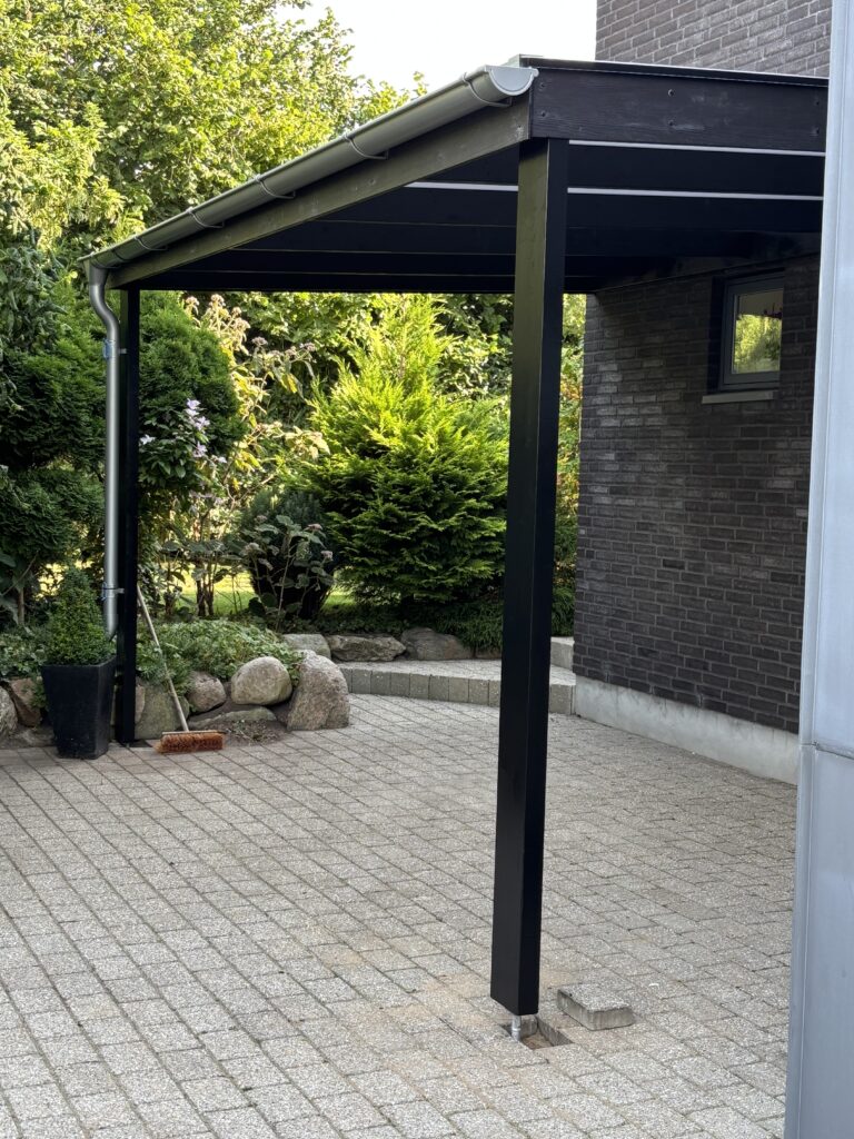 En overdækket terrasse på knap 17 m² med solafvisende Rias-tag i syv lag. Det flerlagede Rias-tag holder solen ude og temperaturen nede, så terrassen kan bruges hele dagen — også midt på sommeren. En enkel løsning, der forlænger sæsonen uden at lukke haven inde.